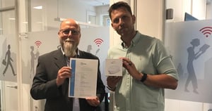 Nemko's Geir Hørthe hands over the first cyber security certificate to Datek's CTO Espen Westgaard after a successful pilot project.