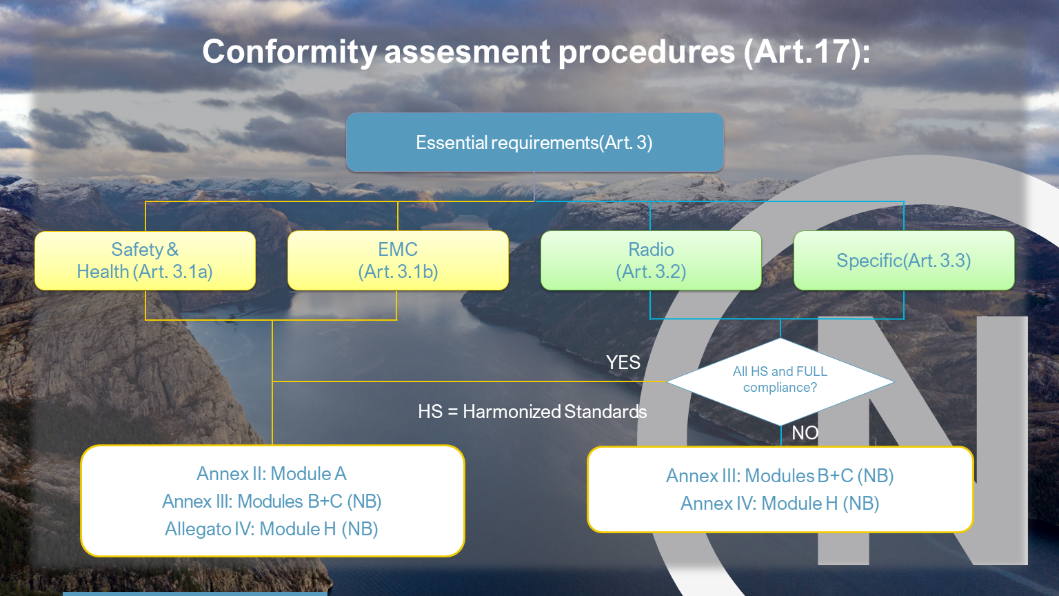 The diagram above shows the possible conformity procedures allowed by the RED Directive. It is possible to note that, where the regulatory standards are not yet harmonized, it will be necessary to use the conformity procedure provided for in Annex III - Modules B (EU-type examination *) and C (conformity to type based on internal production control).